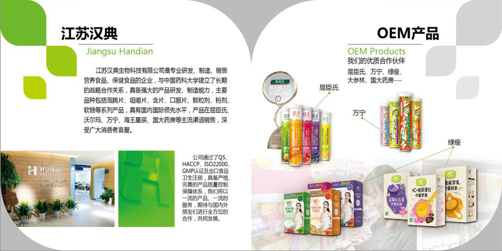 江蘇漢典生物科技股份有限公司位于六朝古都江蘇南京,是專業(yè)生產(chǎn)經(jīng)營特殊膳食營養(yǎng)食品、保健食品的專業(yè)企業(yè),目前產(chǎn)品有片劑、粉劑、膠囊、軟糖四大類五十多個品種,銷售網(wǎng)絡(luò)已經(jīng)覆蓋中國境內(nèi)的100 多個城市,在國內(nèi)大型連鎖藥店、連鎖超市均有銷售,深受廣大消費者的青睞。