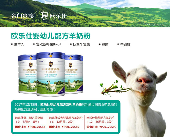 歐樂仕品牌羊奶粉即原名門貴族歐樂仕羊奶粉系列,于2017年12月份獲得國家食藥總局嬰粉注冊(cè)制審核,歐樂仕嬰幼兒羊奶粉工藝獨(dú)特,新鮮營養(yǎng),口碑極佳。
