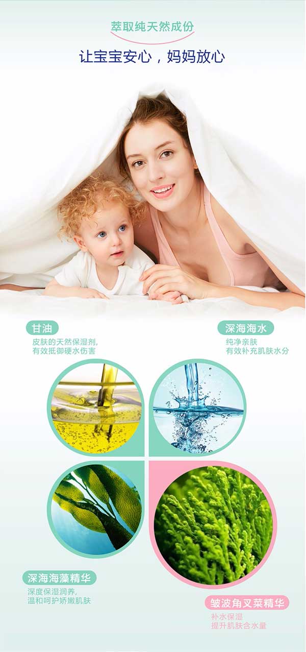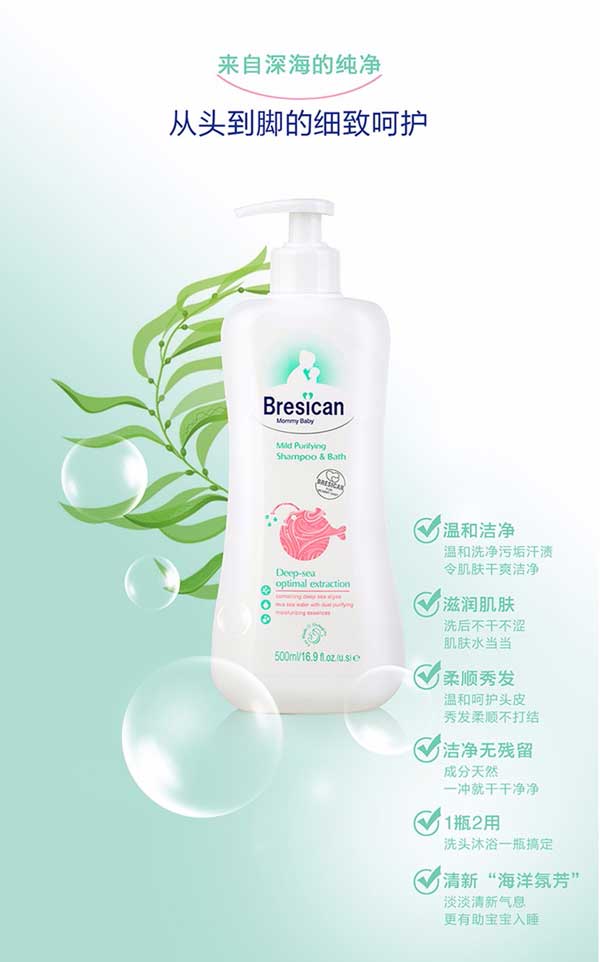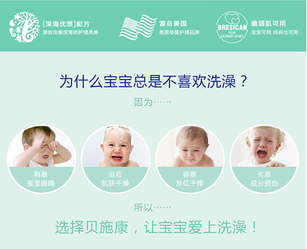 貝施康柔凈洗發(fā)沐浴2合1是 “深海優(yōu)萃”系列的王牌產(chǎn)品,根據(jù)嬰兒特殊肌膚PH特點(diǎn)研制,從深海中萃取自然純凈成分,配方做到純正安全,讓媽媽心安!