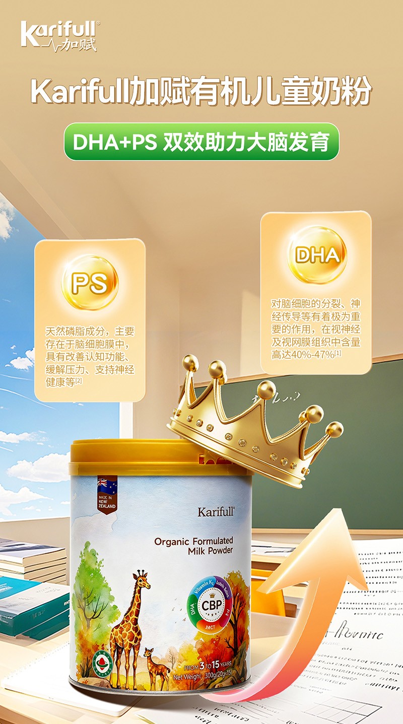 加賦有機(jī)奶粉,三大產(chǎn)能營養(yǎng)素含量較高,滿足3-15歲兒童成長所需的基礎(chǔ)要求,PS 180mg,初乳堿性蛋白200mg,葉黃素脂10mg等其他的維生素礦物質(zhì),補(bǔ)充腦力,視力,骨骼力,免疫力等其他需要