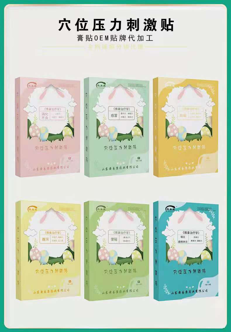 穴位壓力刺激貼小兒的系列比較多,穴位壓力刺激貼通過(guò)刺激穴位的作用來(lái)治療一些常見(jiàn)的疾病,比如感冒、咳嗽、退熱、積食、咽炎、扁桃體炎等等常見(jiàn)病。都有較好的治療功效。山東舜易康藥業(yè),源頭工廠,貼牌定制代加工18853051565