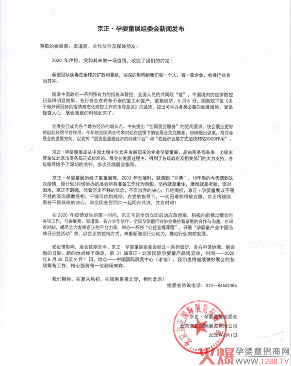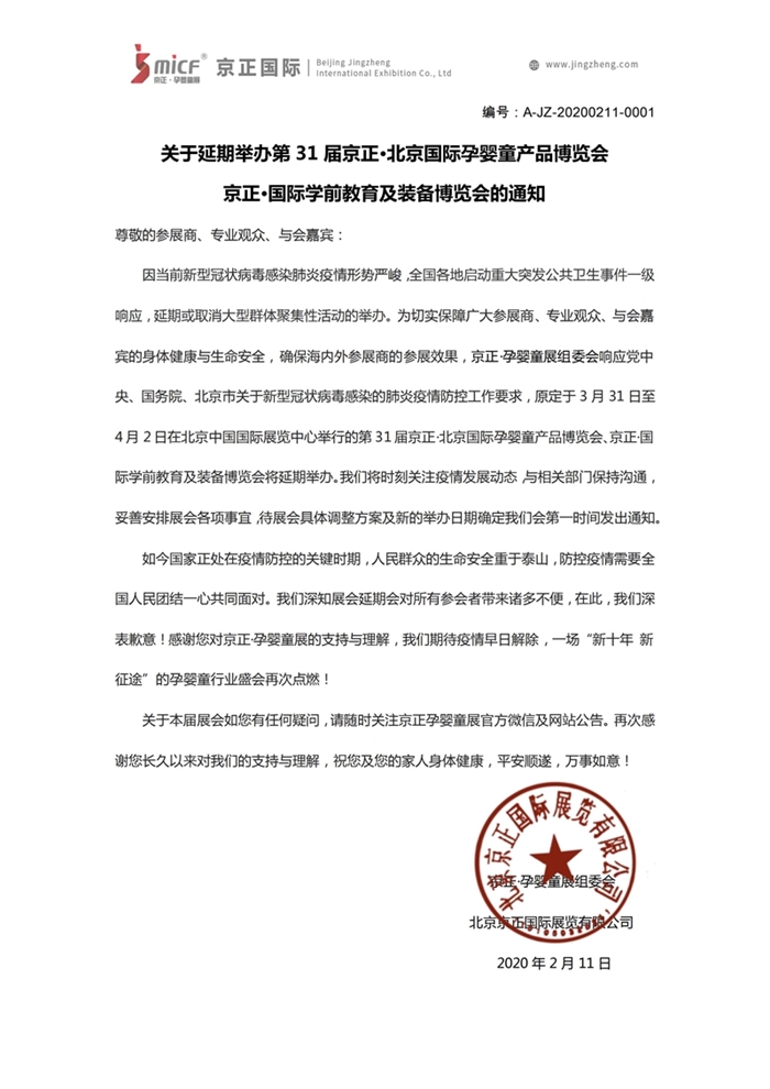 關(guān)于延期舉辦第31屆京正北京國際孕嬰童博覽會(huì)京正國際學(xué)前教育及裝備博覽會(huì)的通知。
